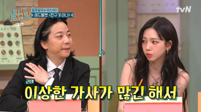방송 중 레드벨벳의 '친구가 아냐' 가사를 맞추는 대결에서 에스파 멤버들은 어려움을 겪었습니다. 특히 카리나는 "레드벨벳의 수록곡도 다 알지만, 이 곡은 유일하게 모른다"며 당황했습니다. '꼴'과 '꼭' 사이에서 갈등하던 멤버들 중 카리나는 SM 가사에 대한 냉정한 평가를 던져 눈길을 끌었습니다.